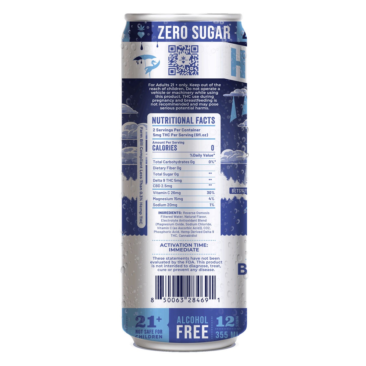 Ingredients: Reverse Osmosis Filtered Water, Natural Flavor, Electrolyte-Antioxidant Blend (Magnesium Oxide, Sodium Chloride, Vitamin C (as Ascorbic Acid)), CO2, Phosphoric Acid, Hemp-Derived Delta 9 THC, Cannabidiol