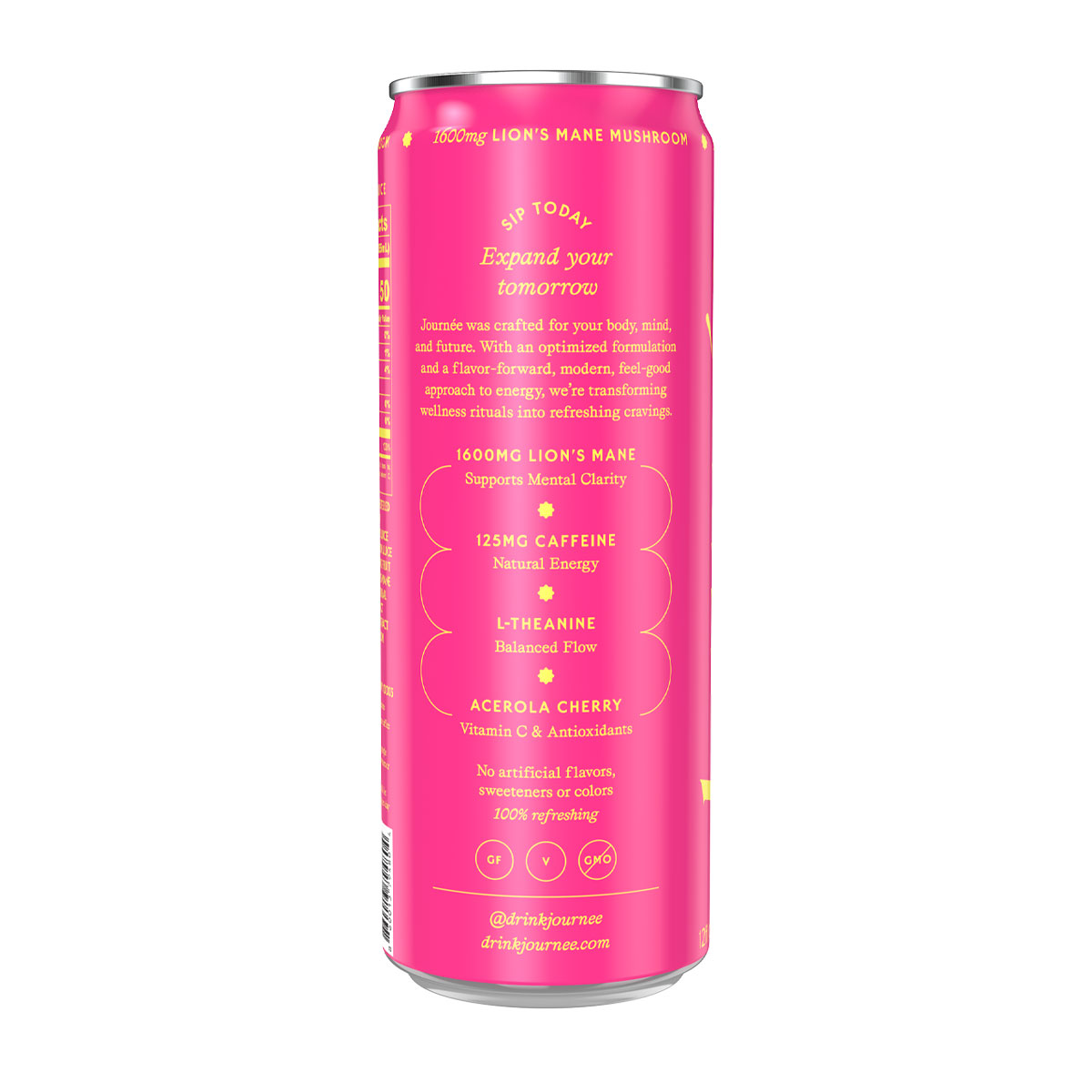 A vibrant, juicy sip with rich raspberry, mellow dragon fruit notes, and a zesty finish. Crafted with our hero formulation of 1600 mg of Lion’s Mane, natural caffeine and a blend of nourishing functional ingredients. Journée delivers an uplifting mind-and-body energy that helps you stay sharp, feel-good, and enjoy a juice-forward taste.
