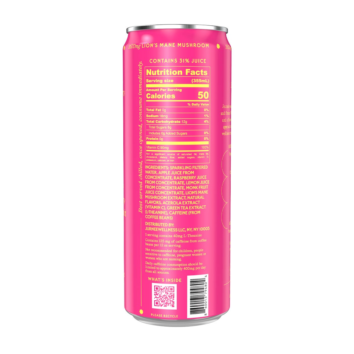 Ingredients: Sparkling Filtered Water, Apple Juice From Concentrate, Raspberry Juice From Concentrate, Lemon Juice from concentrate, Monk Fruit Juice Concentrate, Lion’s Mane Mushroom Extract, Natural Flavors, Acerola Extract (Vitamin C), Green Tea Extract (L-Theanine), Caffeine (From Coffee Beans)
