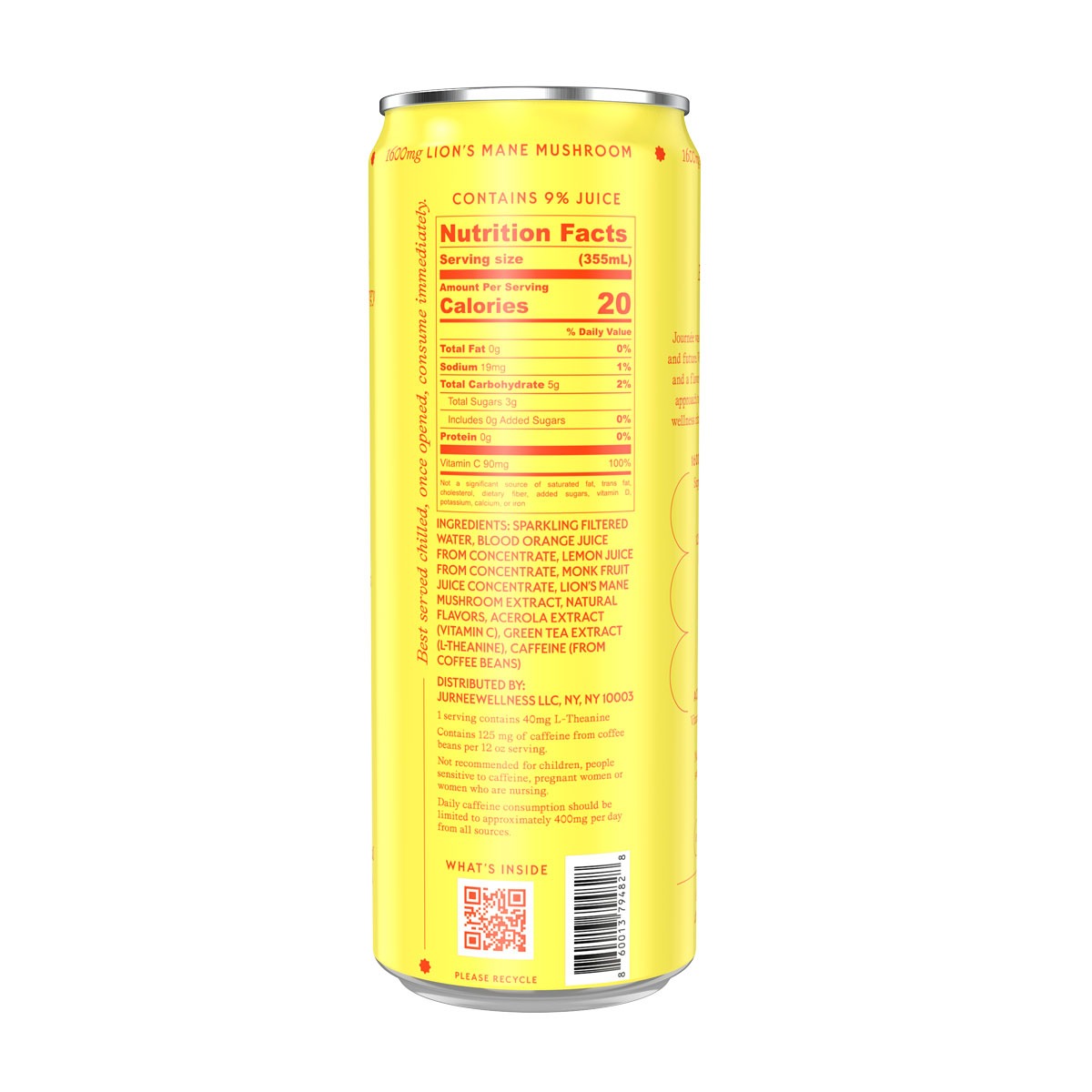 Ingredients: Sparkling Filtered Water, Blood Orange juice from concentrate, Lemon Juice from concentrate, Monk Fruit Juice Concentrate, Lion’s Mane Mushroom Extract, Natural Flavors, Acerola Extract (Vitamin C), Caffeine (From Coffee Beans), Green Tea Extract (L-Theanine)
